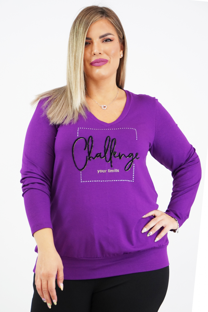 Μπλούζα Viscose, V ντεκολτέ, στάμπα εμπρός "Challenge", με ελαστική μπάσκα στο τελείωμα, σε ίσια άνετη γραμμή.